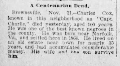 This article notes Cox's nickname as "Captain Charlie." It is unknown where Cox picked up this moniker. If he were born near Norfolk, he may have worked at the port there. Or he may have worked on the river at Brownsville, where passenger and cargo ships were docked and maintained during the 1800's. The article notes that Cox was financially successful but does not state the kind of work in which he had engaged.